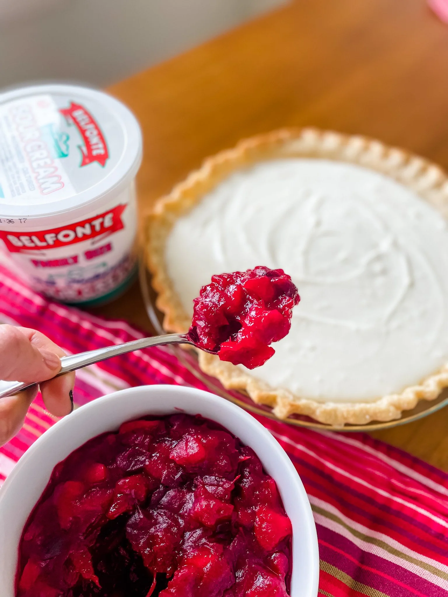 Assemble the pie by spreading sour cream filling evenly across pie crust. Then, evenly spread homemade cranberry sauce so that it covers the filling and the entire pie. Refrigerate until ready to serve.